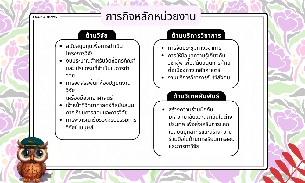 ติดต่อประสานงานกับหน่วยงานภายในและภายนอกมหาวิทยาลัยทั้งในและต่างประเทศ ในเรื่องความร่วมมือด้านวิชาการ การศึกษา ฝึกอบรมวิจัย ประชุมสัมมนาและอื่นๆที่เกี่ยวข้อง เพื่อพัฒนาบุคลากรการเรียนการสอนและการวิจัย