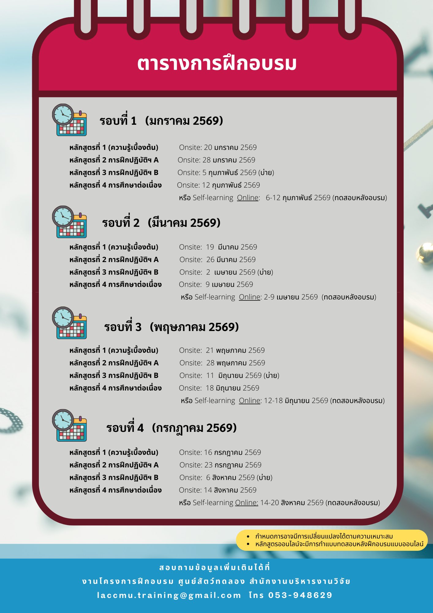 สำนักบริหารงานวิจัย สำนักงานมหาวิทยาลัย กำหนดจัดโครงการฝึกอบรมเพื่อส่งเสริมความรู้และทักษะด้านการปฏิบัติงานกับสัตว์ทดลอง ณ อาคารศูนย์สัตว์ทดลอง รวมทั้งสิ้น 4 หลักสูตร ดังนี้