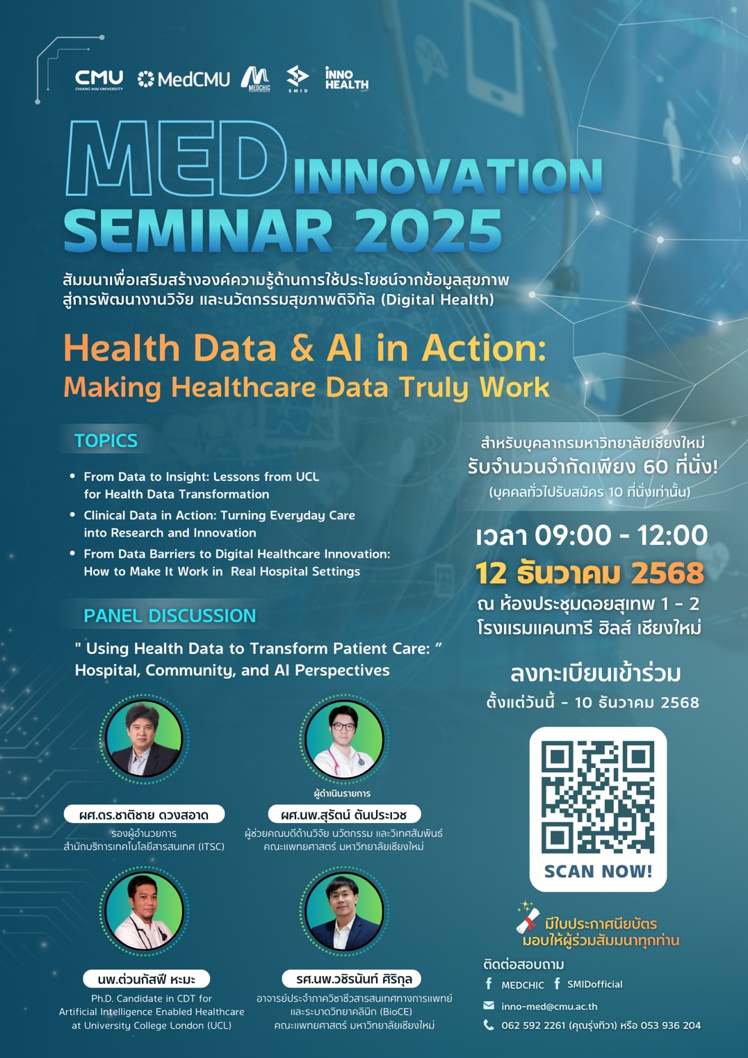พบกับเวทีที่รวมตัว แพทย์ นักวิจัย นักพัฒนา และนักวิเคราะห์ข้อมูลที่จะมาร่วมแชร์ประสบการณ์ จากห้องปฏิบัติการจริง สู่นวัตกรรมที่ใช้ได้จริงกับ ✨ MED Innovation Seminar 2025 — Health Data & AI in Action