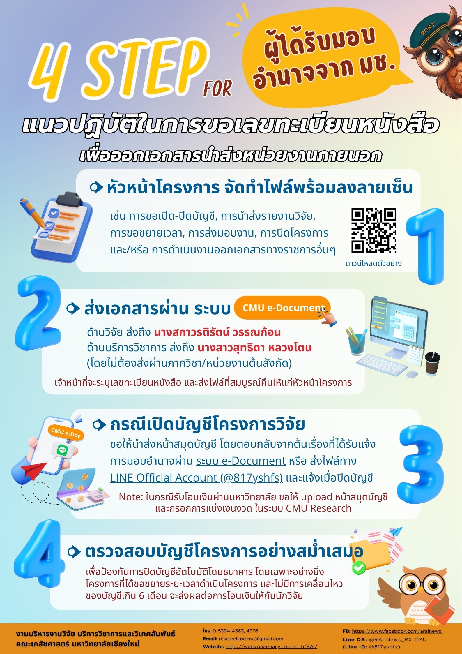 เพื่อให้การดำเนินการขอเลขทะเบียนหนังสือเป็นไปด้วยความเรียบร้อย หน่วยบริหารงานวิจัย ขอความร่วมมือหัวหน้าโครงการจัดส่งเอกสารที่ประสงค์ขอเลขทะเบียนหนังสือเพื่อนำส่งออกภายนอก ถึง เจ้าหน้าที่โดยตรงผ่านระบบ e-Document ดังนี้