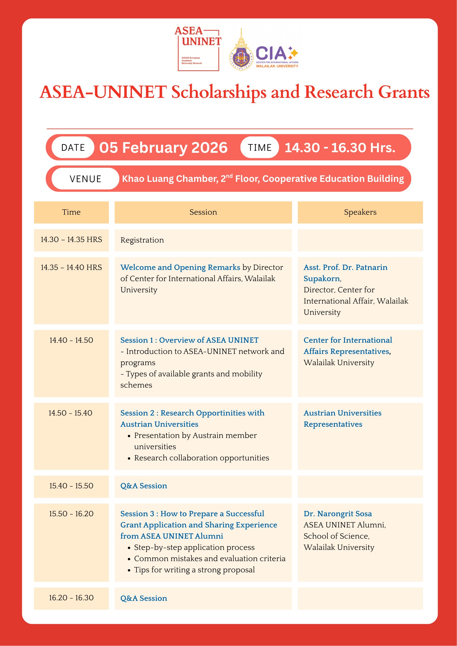 กิจกรรมดังกล่าวมีวัตถุประสงค์เพื่อสร้างความรู้ความเข้าใจเกี่ยวกับบทบาทและแหล่งทุนของเครือข่าย ASEA-UNINET ถ่ายทอดแนวทางและขั้นตอนการจัดทำข้อเสนอโครงการเพื่อขอรับทุนวิจัยอย่างมีประสิทธิภาพ รวมถึงนำเสนอข้อมูลโอกาสด้านการแลกเปลี่ยนนักศึกษา บุคลากร และการทำวิจัยร่วมกับมหาวิทยาลัยพันธมิตรในประเทศออสเตรีย โดยได้รับเกียรติจาก ดร.ณรงฤทธิ์ โสสะ ศิษย์เก่า ASEA-UNINET จากมหาวิทยาลัยวลัยลักษณ์ เป็นผู้ถ่ายทอดประสบการณ์และแนวปฏิบัติในการจัดทำข้อเสนอโครงการ