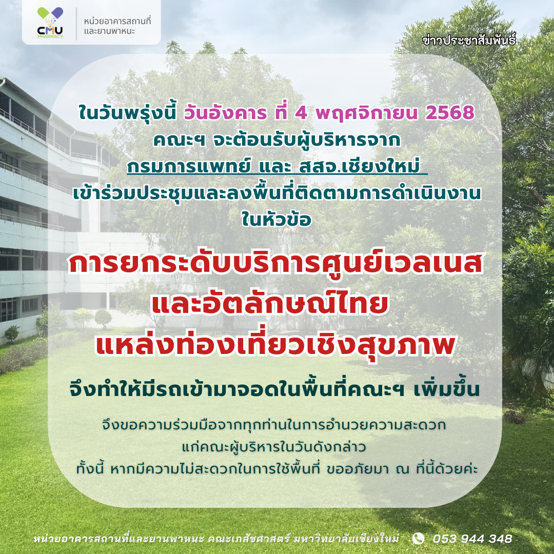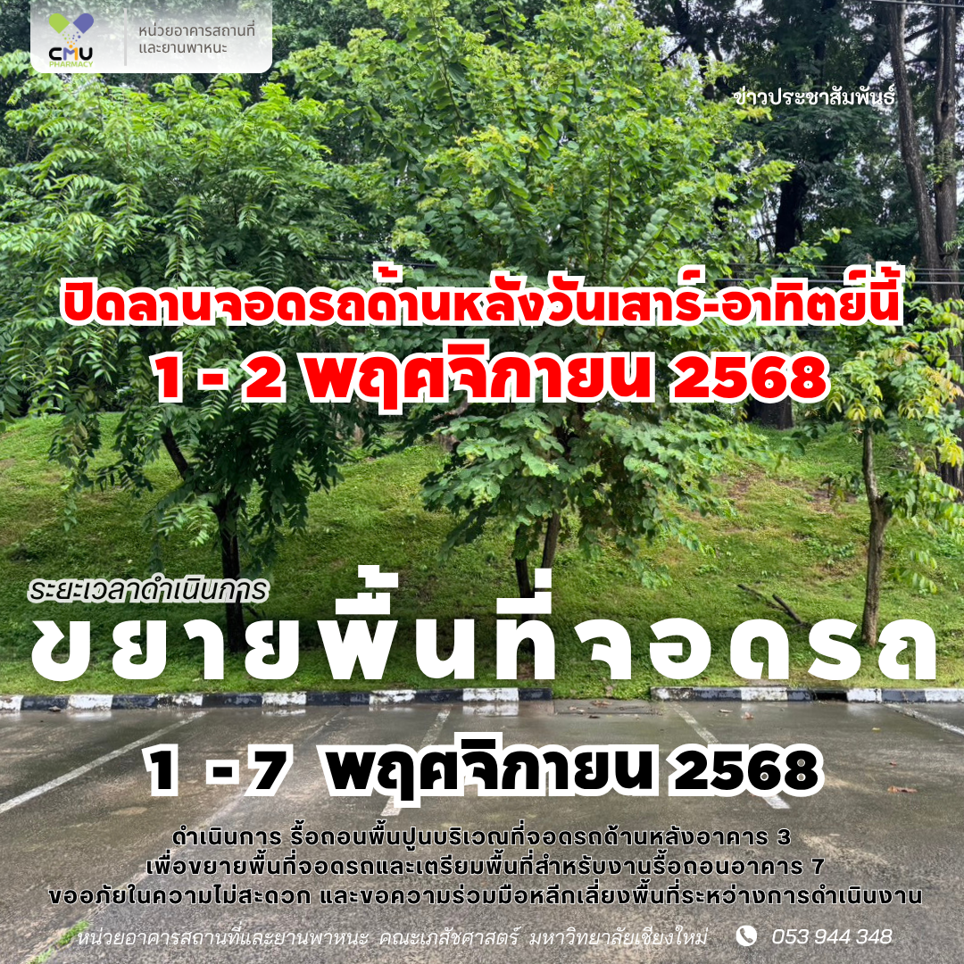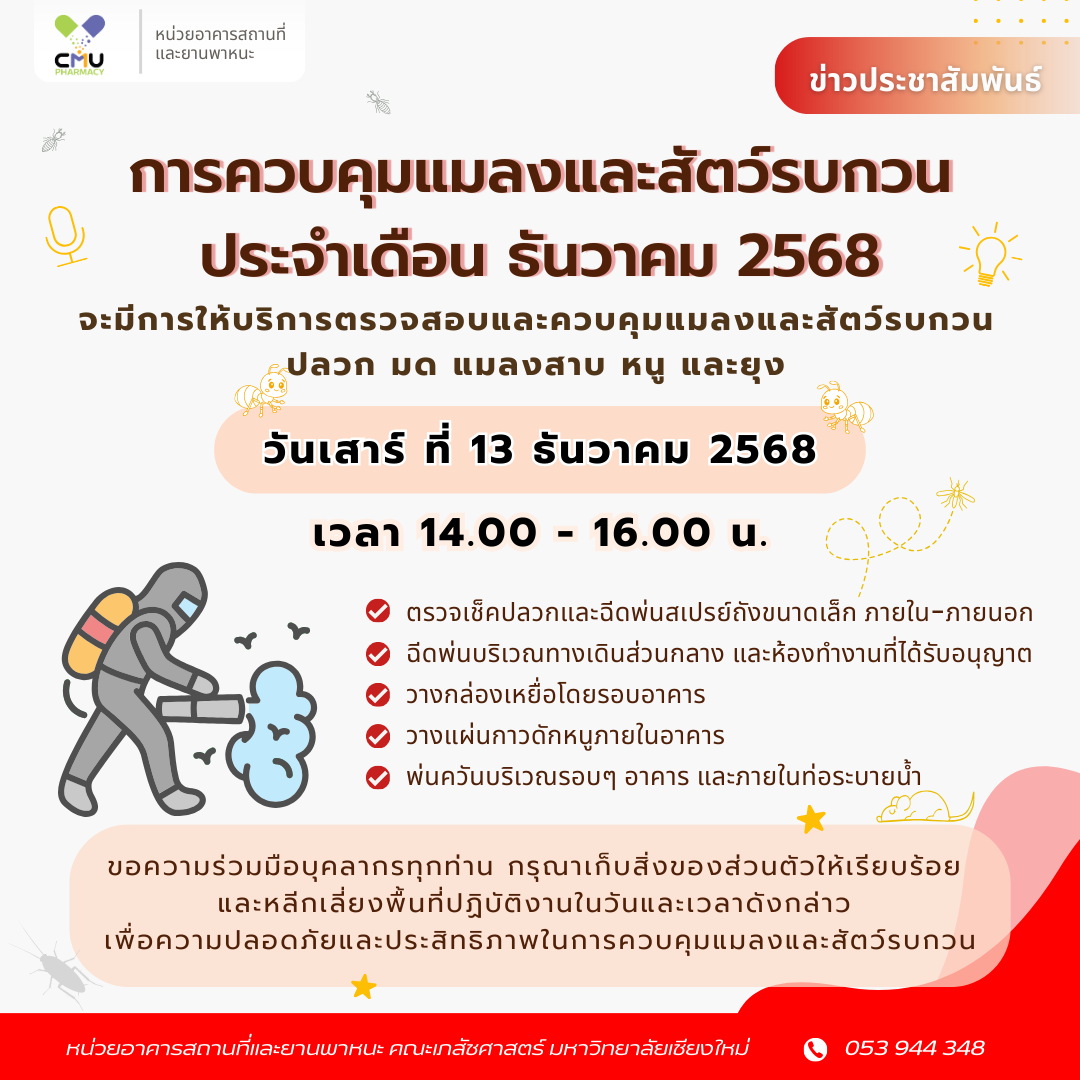 📢 ประชาสัมพันธ์แจ้ง การตรวจสอบและควบคุมแมลงและสัตว์รบกวนหน่วยอาคารสถานที่ฯ จะดำเนินการตรวจสอบและควบคุมปลวก มด แมลงสาบ หนู และยุง📆 วันเสาร์ที่ 13 ธันวาคม 2568 เวลา 14.00 - 16.00 น.🟡 ตรวจเช็คปลวก พร้อมฉีดพ่นสารภายใน–ภายนอกอาคาร🟡 วางกล่องเหยื่อล่อหนู และแผ่นกาวดักหนู🟡 พ่นควันบริเวณรอบอาคารและภายในท่อระบายน้ำขอความร่วมมือบุคลากรทุกท่าน กรุณาเก็บสิ่งของส่วนตัวให้เรียบร้อย และหลีกเลี่ยงพื้นที่ปฏิบัติงานในวันและเวลาดังกล่าว 🙏