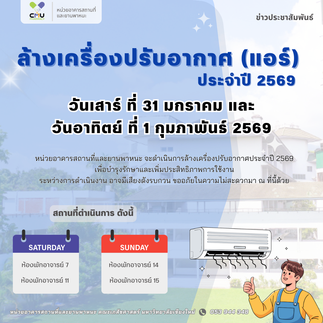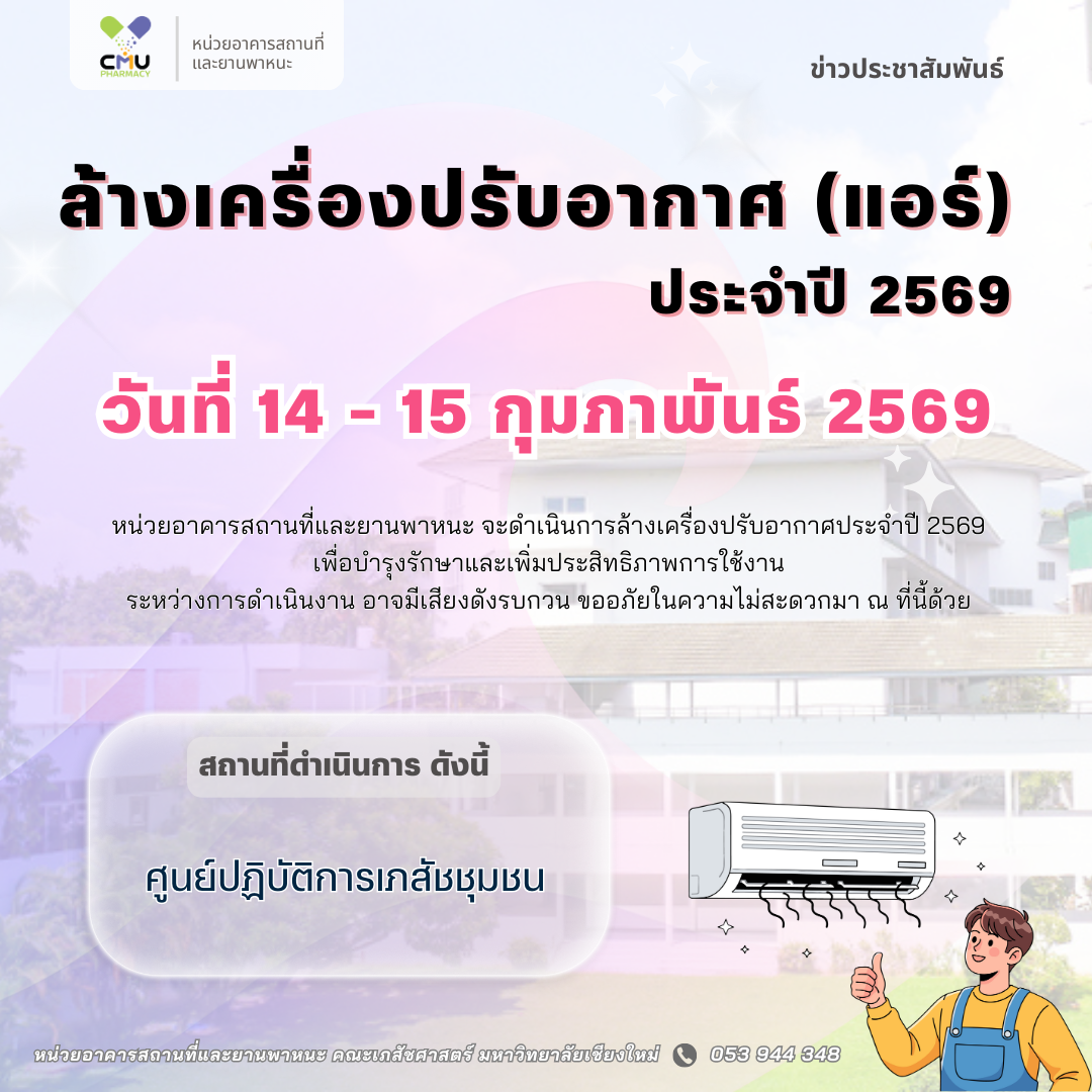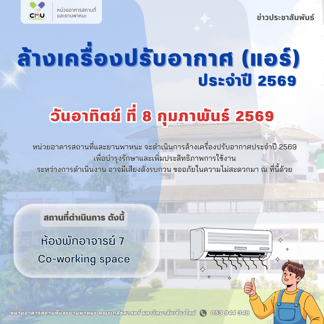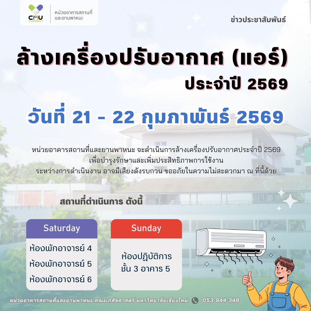 หน่วยอาคารสถานที่และยานพาหนะ จะดำเนินการล้างเครื่องปรับอากาศประจำปี 2569📅 วันเสาร์ที่ 21 กุมภาพันธ์ 2569🔹 ห้องพักอาจารย์ 4🔹 ห้องพักอาจารย์ 5🔹 ห้องพักอาจารย์ 6📅 วันอาทิตย์ที่ 22 กุมภาพันธ์ 2569🔹 ห้องปฏิบัติการชั้น 3 อาคาร 5ขออภัยในความไม่สะดวก และขอขอบคุณทุกท่านที่ให้ความร่วมมือค่ะ