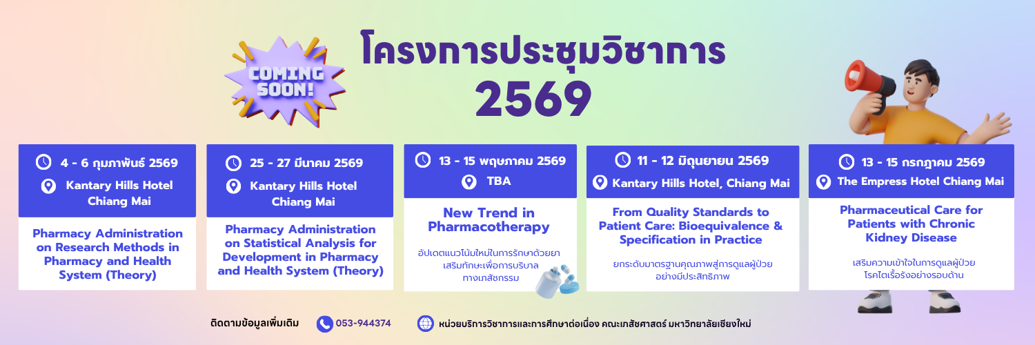 ประชุมวิชาการ เรื่อง Skin scientific insight : Addressing the root cause effectivelyระหว่างวันที่ 29 มิถุนายน 2568 ณ โรงแรมดิเอ็มเพรส เชียงใหม่ (Hybrid Meeting)------------------------------------------------ เปิดรับสมัคร เภสัชกร คณาจารย์ และนักศึกษาเภสัชศาสตร์ onsite จำนวน 50 คนonline ไม่จำกัดจำนวน------------------------------------------------ แบบฟอร์มลงทะเบียน >>>> https://cmu.to/sbbEuตรวจสอบรายชื่อผู้เข้าร่วมประชุม >>>> https://cmu.to/7bEY9(เมื่อกดส่งแบบฟอร์มแล้ว เจ้าหน้าที่จะทำการยืนยันการสมัครและประกาศรายชื่อของท่านภายใน 1-2 วันทำการ) ------------------------------------------------ สอบถามรายละเอียดการประชุมเพิ่มเติมได้ที่ หน่วยบริการวิชาการ คณะเภสัชศาสตร์ มช. โทร. 053-944374 / Email: cpe.pharmcmu@gmail.com / Line ID : @wal3469f หมายเหตุ: อยู่ระหว่างการพิจารณาหน่วยกิตการศึกษาต่อเนื่อง