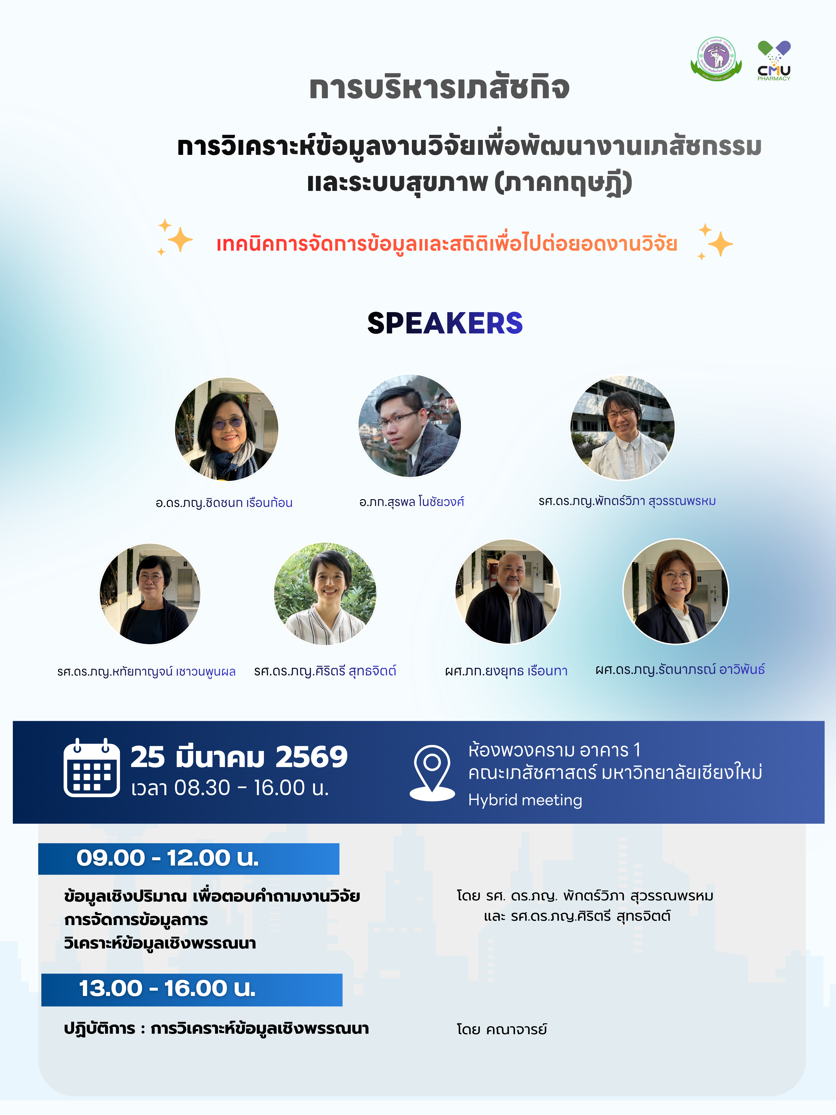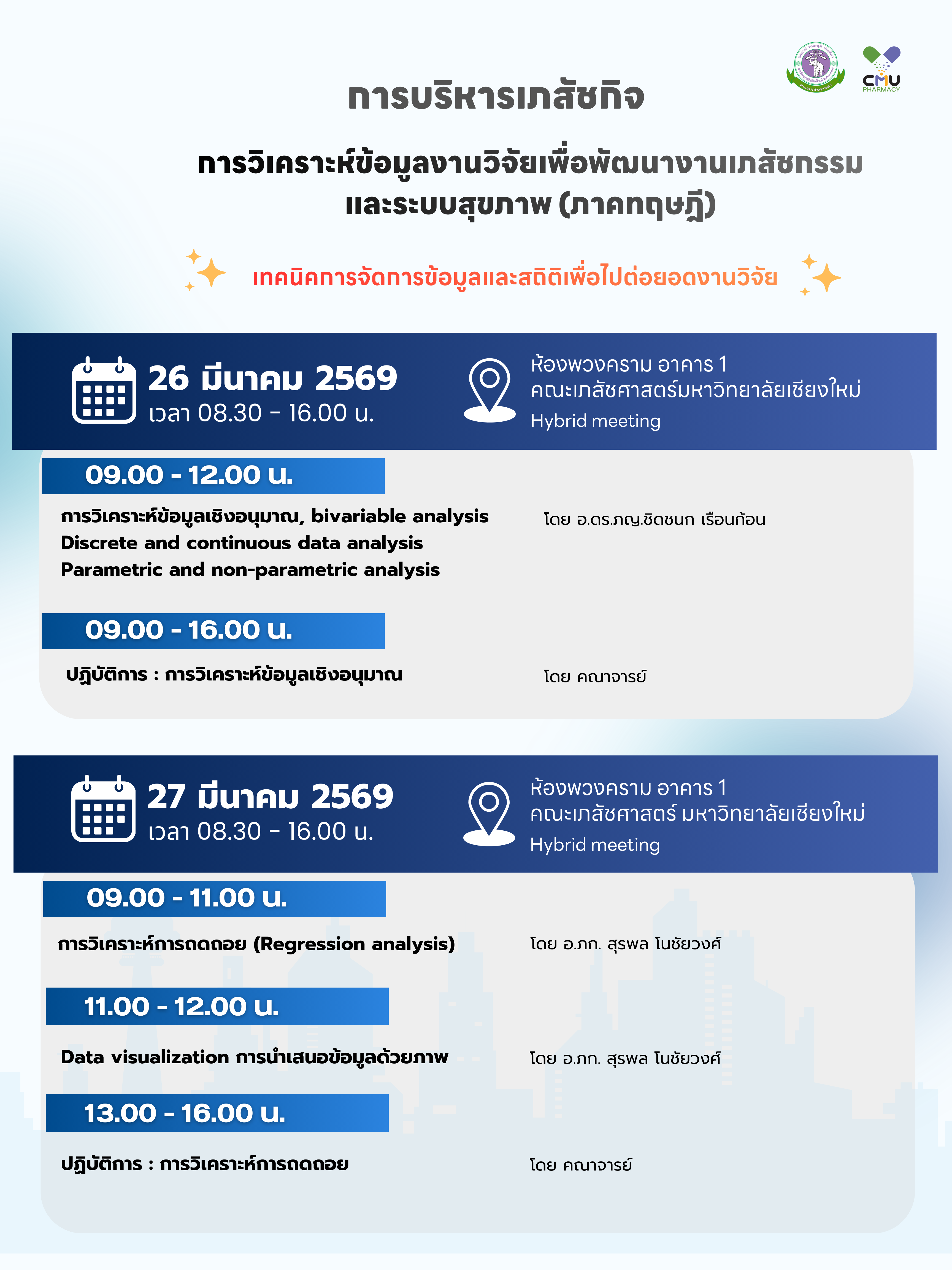 การประชุมวิชาการ ประจำปีงบประมาณ 2569 เรื่อง การวิเคราะห์ข้อมูลงานวิจัยเพื่อพัฒนางานเภสัชกรรมและระบบสุขภาพ (ภาคทฤษฎี) Statistical Analysis for Pharmacy and Health System Development (Theory)