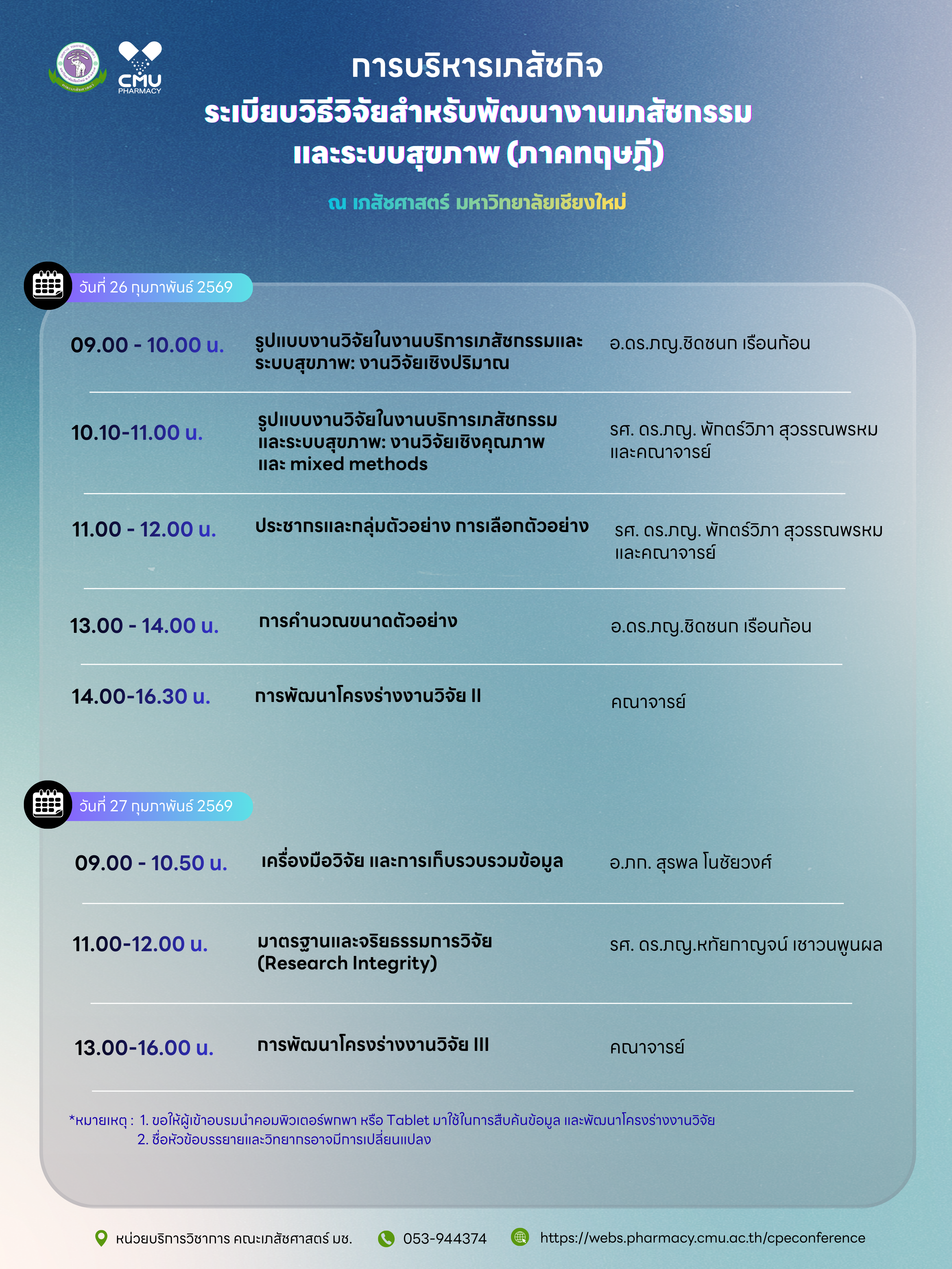 ประชุมวิชาการ ประจำปีงบประมาณ 2569 เรื่อง ระเบียบวิธีวิจัยสำหรับพัฒนางานเภสัชกรรมและระบบสุขภาพ (ภาคทฤษฎี) Research Methods for Pharmacy and Health System Development (Theory)