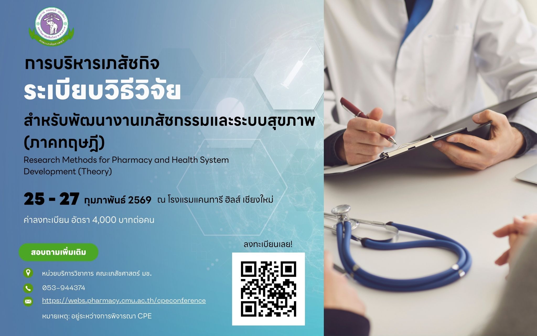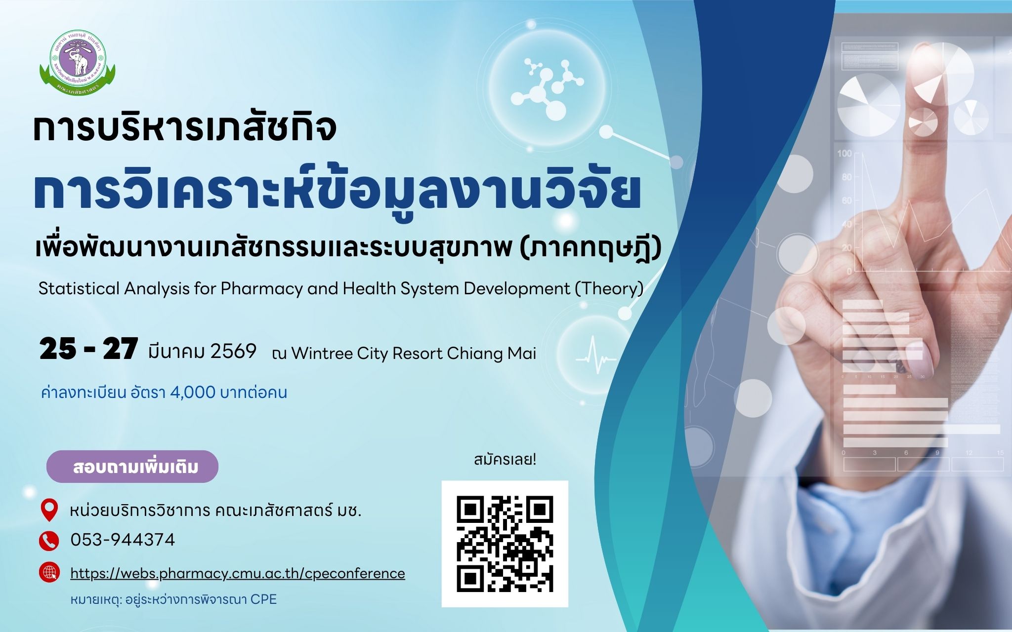การประชุมวิชาการ ประจำปีงบประมาณ 2569 เรื่อง การวิเคราะห์ข้อมูลงานวิจัยเพื่อพัฒนางานเภสัชกรรมและระบบสุขภาพ (ภาคทฤษฎี) Statistical Analysis for Pharmacy and Health System Development (Theory) ระหว่างวันที่ 25 – 27 มีนาคม 2569ณ Wintree City Resort Chiang Maiพิกัดโรงแรม: https://maps.app.goo.gl/u65igrmiDgWUXnRB8จำนวนเปิดรับสมัคร: 60 คน*** ในกรณีที่มีผู้ลงทะเบียนเกินกว่าจำนวนที่รองรับได้ ผู้จัดงานขอสงวนสิทธิ์การเข้าร่วมประชุมให้แก่ผู้ที่ชำระค่าลงทะเบียนก่อน ***อัตราค่าลงทะเบียน 4,000 บาท (สี่พันบาทถ้วน) สมัครและชำระเงิน ภายในวันที่ 16 มีนาคม 2569ลงทะเบียน >>>> https://cmu.to/1EYnNตรวจสอบรายชื่อผู้เข้าร่วมประชุม >>>> https://cmu.to/Mu4I5(เมื่อชำระชำระค่าลงทะเบียนแล้ว เจ้าหน้าที่จะทำการยืนยันการสมัครและประกาศรายชื่อของท่านภายใน 1-2 วันทำการ) เอกสารที่เกี่ยวข้องสามารถ Download ตามเอกสารแนบท้ายนี้------------------------------------------------ สอบถามรายละเอียดการประชุมเพิ่มเติมได้ที่ หน่วยบริการวิชาการ คณะเภสัชศาสตร์ มช. โทร. 053-944374 / Email: cpe.pharmcmu@gmail.com / Line ID : @wal3469f