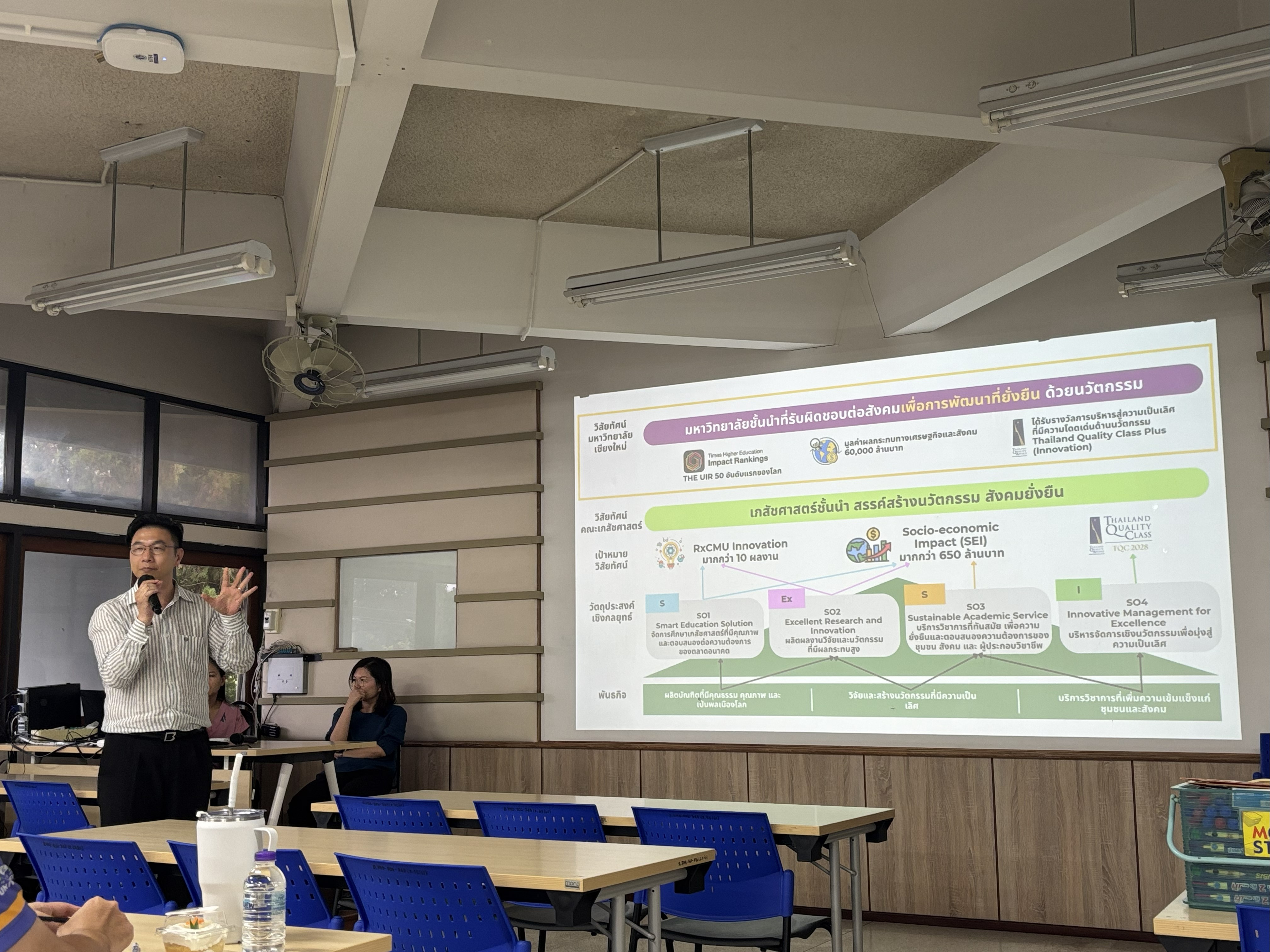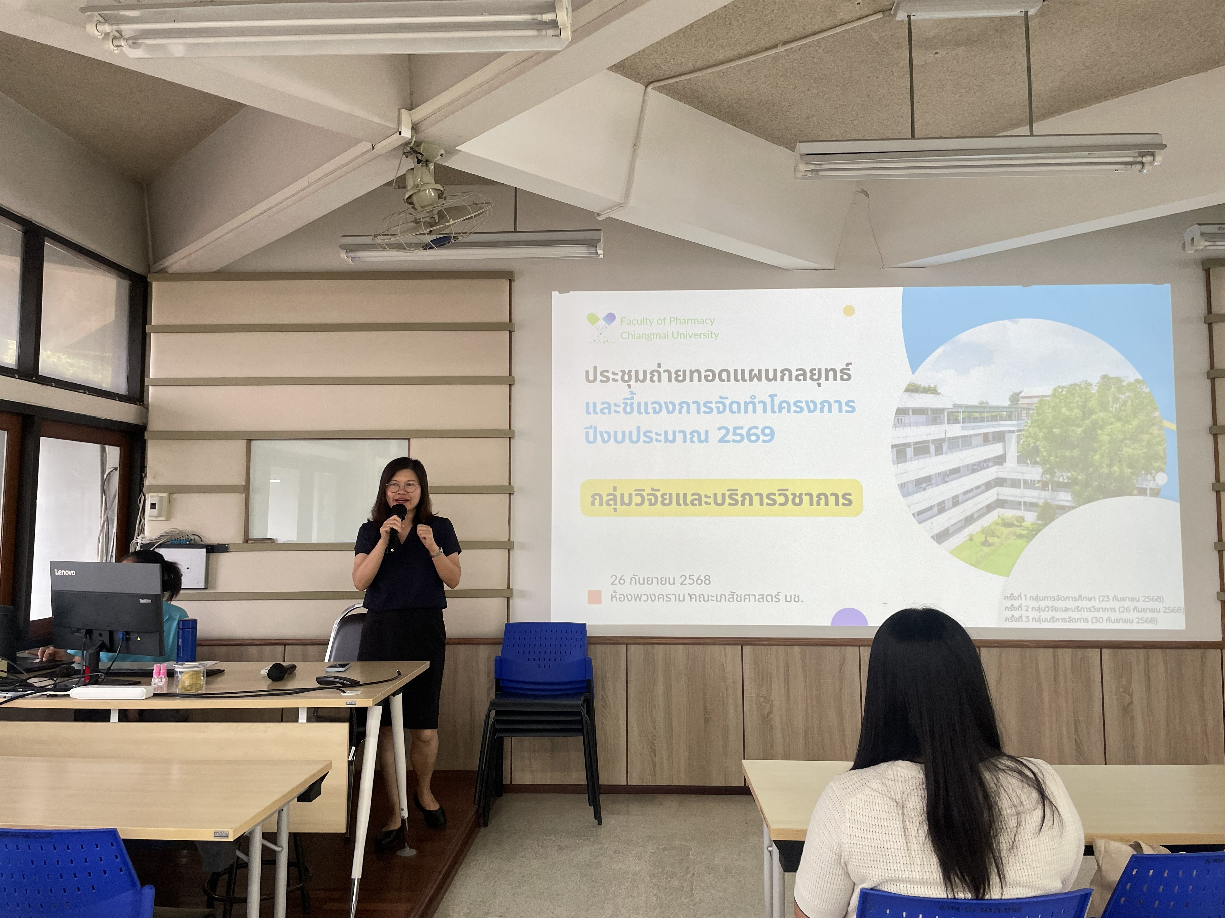 คณะเภสัชศาสตร์ มหาวิทยาลัยเชียงใหม่ จัดกิจกรรมถ่ายทอดแผนกลยุทธ์คณะเภสัชศาสตร์ พ.ศ.2568-2571 ปรับปรุงปีงบประมาณ พ.ศ.2569 และแนวทางการจัดทำโครงการประจำปีงบประมาณ พ.ศ.2569 เพื่อให้คณาจารย์และบุคลากรได้เข้าใจบทบาทและแนวทางการดำเนินงานร่วมกัน ตลอดจนใช้เป็นโอกาสในการรับฟังข้อคิดเห็น/ข้อเสนอแนะในการพัฒนาคณะและร่วมกันทบทวนและปรับปรุงแผนงาน/โครงการจากปีที่ผ่านมา เพื่อยกระดับประสิทธิภาพการทำงานและผลลัพธ์ให้สอดคล้องกับเป้าหมายของคณะในระยะยาว โดยมี ศาสตราจารย์ปฏิบัติ ดร.ภก.สุพัฒน์ จิรานุสรณ์กุล คณบดีคณะเภสัชศาสตร์ และ ผู้ช่วยศาสตราจารย์ ดร.ภญ.ภูริดา เวียนทอง รองคณบดีด้านนโยบายและแผนและประกันคุณภาพการศึกษา บรรยายถ่ายทอดวิสัยทัศน์ เป้าหมายและแผนกลยุทธ์คณะเภสัชศาสตร์ พ.ศ.2568-2571 ปรับปรุงปีงบประมาณ พ.ศ.2569 โดยแบ่งกิจกรรมเป็นกลุ่มด้านการจัดการศึกษา การวิจัยและบริการวิชาการ และการบริหารจัดการ ซึ่งจัดกิจกรรมในวันที่ 23,26 และ 30 กันยายน 2568 ณ ห้องพวงคราม คณะเภสัชศาสตร์